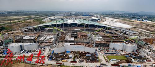 首飞后直升机从香港返回广州,直升机上飞过建设中的白云国际机场T3航站楼。