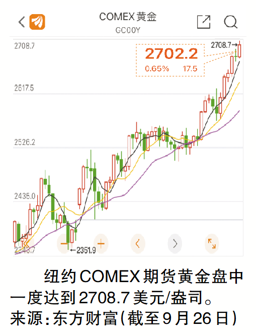 近期,黄金价格一路高歌猛进。9月26日,黄金现货价格创下历史新高,国际伦敦现货黄金突破2672美元/盎司,再创历史新高;纽约COMEX期货黄金主力合约在盘中一度达到2708.7美元/盎司,刷新历史高点。