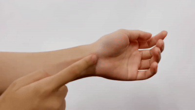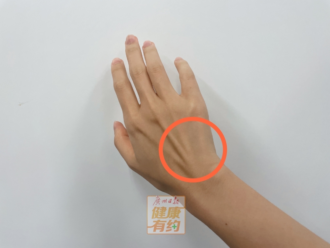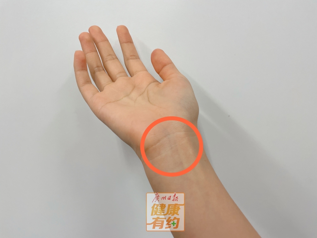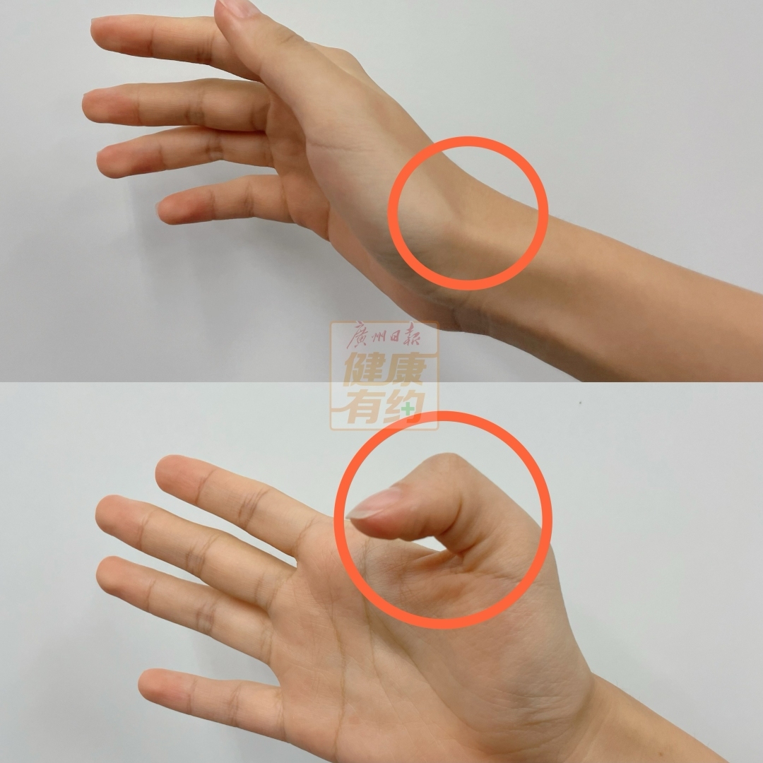 屈拇握拳试验:拇指靠在掌心,另外4根手指用力握住大拇指,手臂伸直,最大程度弯曲手腕,坚持5秒以上,如果手腕处(上图红圈位置)有明显的痛感,就可能是腱鞘炎的表现。