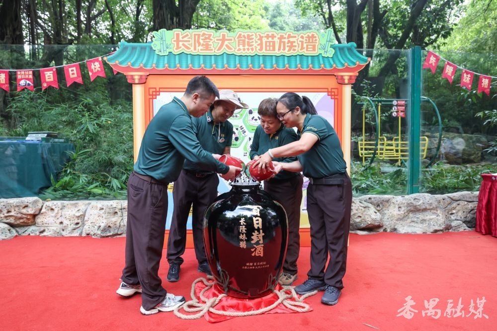 现场举行的百日封酒仪式备受瞩目。长隆领导及小朋友游客们一齐将百岁酒汇注入酒坛,再由领导在印有“妹猪”脚印的红纸上题字祝福,最后进行塑封、盖红布、贴封条,动物界首坛“女儿红”封酒仪式完成。同时,保育员还为“妹猪”与“萌萌”送上精心准备的百日“女儿红”等丰容食物,祝“妹猪”百日快乐。游客在大熊猫月子中心与“萌萌”“妹猪”同框合影,留下珍贵的百日纪念照。