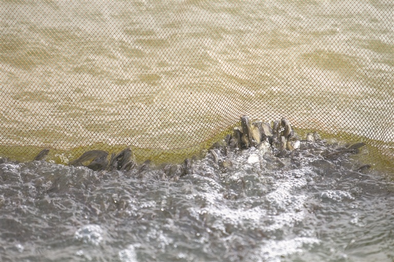 “一、二、三,拉……”在何建波的渔场,随着渔网越收越紧,一条条翻腾的小鱼苗接二连三跃出水面,溅起层层浪花。何建波随即用水盆装了半盆鱼苗,“穗丰鲫”鱼苗整体呈黑色,个头不大,部分甚至没有小拇指粗,但活力十足,不停地游动着。