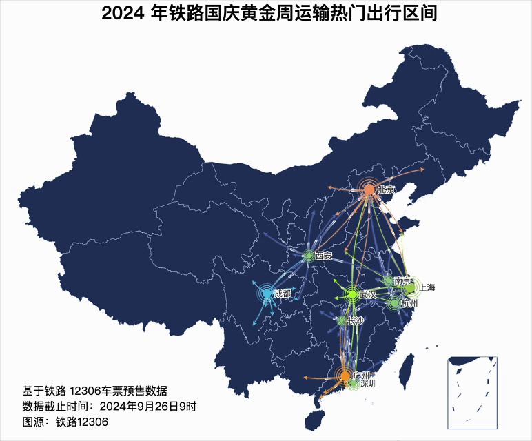 从火车票预售情况来看,国庆黄金周运输期间热门出发城市主要有北京、上海、广州、成都、武汉、杭州、深圳、西安、南京、长沙;热门到达城市主要有北京、上海、广州、成都、杭州、武汉、深圳、西安、南京、长沙;成都至西安、北京至上海、北京至沈阳、广州至南宁、广州至湛江、北京至呼和浩特、广州至汕头、上海至武汉、北京至太原、大连至沈阳等热门区间客流相对集中。