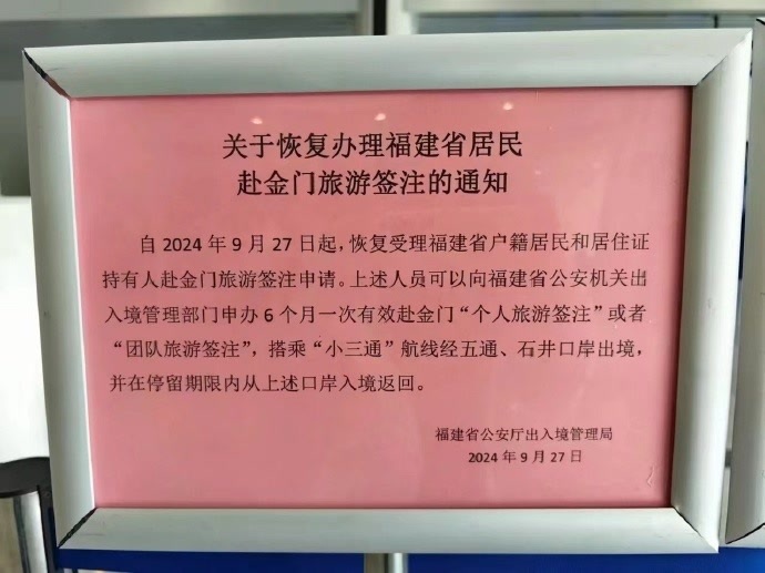 福建省公安厅出入境管理局今日(27日)发布《关于恢复办理福建省居民赴金门旅游签注的通知》。据公告,自2024年9月27日起,恢复受理福建省户籍居民和居住证持有人赴金门旅游签注申请。上述人员可以向福建省公安机关出入境管理部门申办6个月一次有效赴金门“个人旅游签注”或者“团队旅游签注”,搭乘“小三通”航线经五通、石井口岸出境,并在停留期限内从上述口岸入境返回。