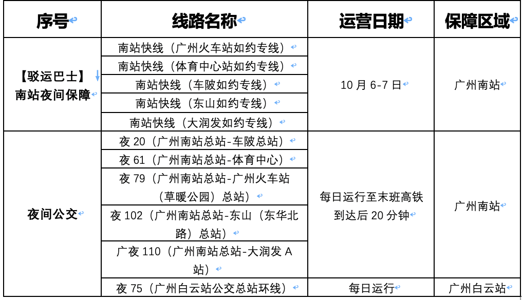 此外,国庆期间,广州巴士集团将重点做好广州南站、广州白云站等区域的客流保障工作,科学合理安排公共汽车夜20、夜61、夜75、夜79、夜102、广夜110路等线路发班密度,同时计划在高峰时段开行多条南站如约快线,连接广州南站至广州火车站、体育中心(体育东)、佛山等方向,确保旅客无论多晚都能顺利回家。