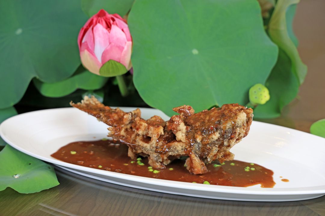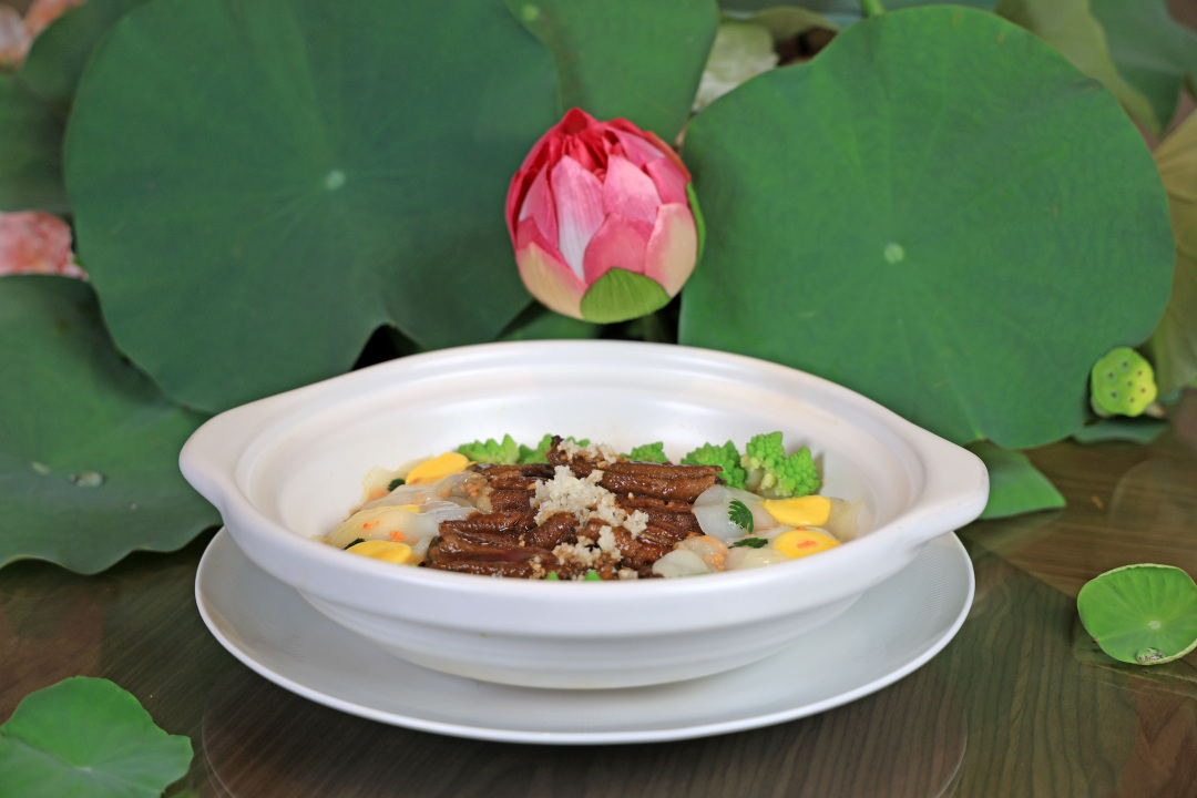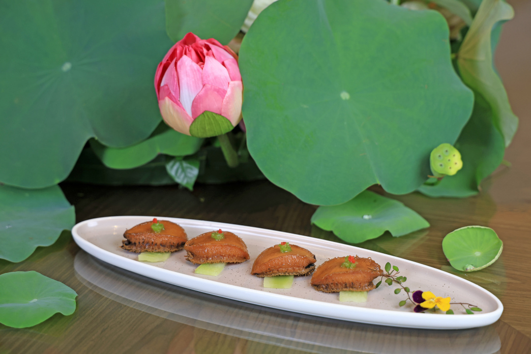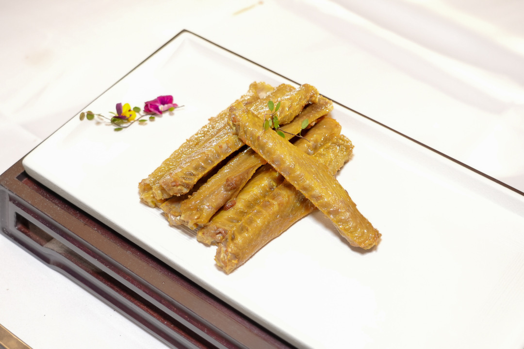 陶然餐厅是广州地区“百佳”餐饮企业之一,获得“国家级五钻酒家”授牌。即日起至10月15日,宾客们在广东温泉宾馆陶然餐厅不仅能品尝到地道的淮扬菜、浙菜与粤菜经典,更能享受到跨界融合的创新美味。南京金陵饭店选择明月炖生敲作为展示菜,杭州西湖国宾馆则带来了炸熘大黄鱼等招牌菜。广东的大厨们拿出了低温五头鲜鲍和风味鹅皇翅。其中,风味鹅皇翅(从化展示菜),原名吮指手抓鹅翼,精选潮汕狮头鹅之鹅翼,搭配精选排骨、猪蹄、老母鸡,以文火慢炖熬制出浓郁汤汁,萃取其精华。辅以多种药材与香料精心烹制,先以文火炖煮三十分钟,再浸渍入味,最后以六成油温炸至金黄酥脆,撒上特制调味粉,装盘后即可呈现。