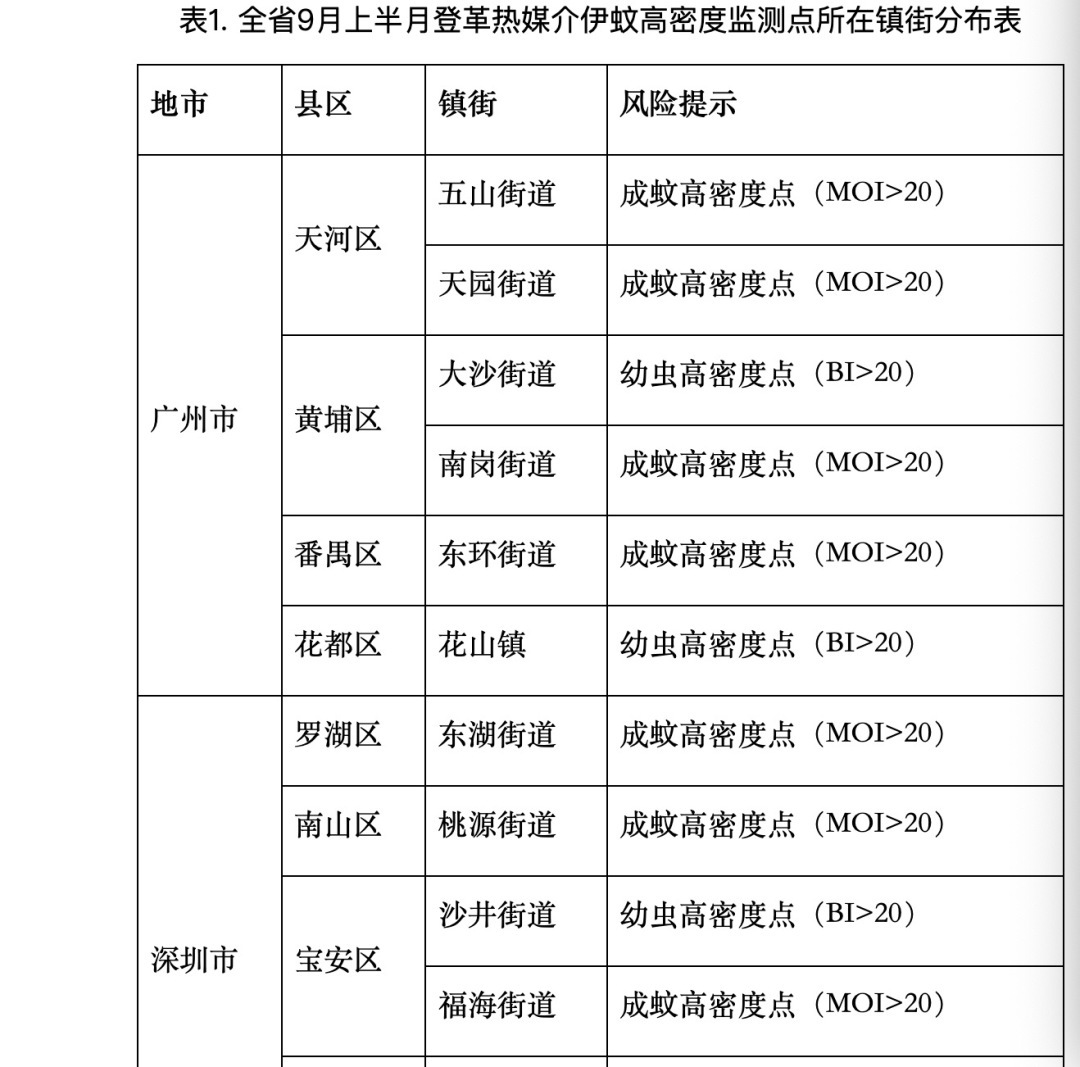 9月26日,广东疾控发布9月下半月最新“蚊子地图”。 全省共监测到30个媒介伊蚊高密度监测点所在镇街,其中广州市和深圳市最多,各有6个,其次为珠海市,有5个。