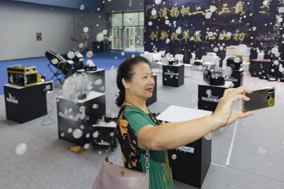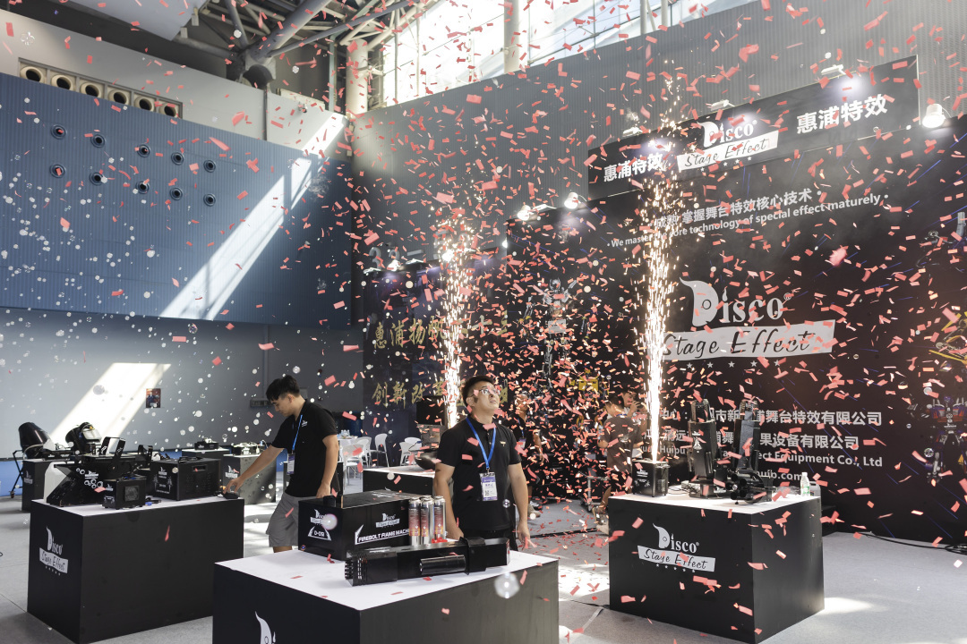 轻盈的泡泡缓缓升起,营造梦幻般的氛围;璀璨的火花四溅,点燃观众的热情;喷出的烟雾和彩带,为整个场景增添了力量和神秘的色彩……惠浦特效展区以其独特的舞台演出和文旅特效技术,为观众呈现了一场视觉、触觉与听觉的全方位感受盛宴。“好漂亮!好神奇!好像在大马戏团的感觉!”现场观众惊叹连连。