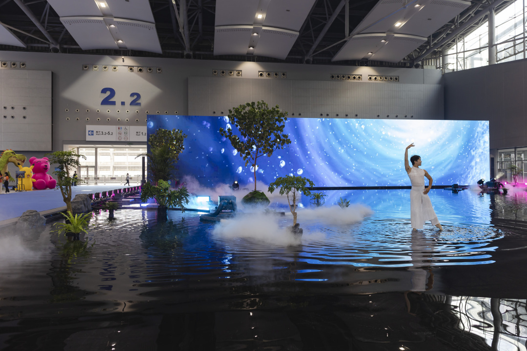 在2.2馆的锐丰文化大型光影秀展台,“无界”主题森野谧境空间更是将自然美学与尖端科技完美融合,为观众营造沉浸式的东方美学体验。展厅以东方美学为设计核心,通过水、木、石等自然元素,打造出一片触手可及的森林秘境,并巧妙地将科技与艺术结合,利用光影效果打破物理空间限制,带来充满生命力的视听冲击。