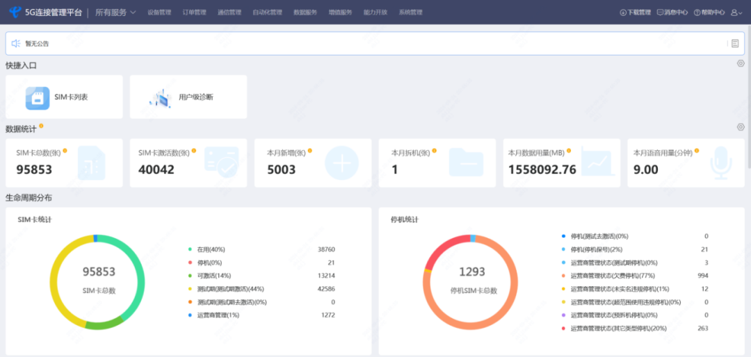 平台功能方面,提供涵盖NB-IoT/Cat.1/Cat.4/5G及5G RedCap等高低搭配、安全可靠的物联网连接基础业务管理服务,并围绕用户实际业务需求,创新提供翼联短信、轻翼定位、B2B2C等标准产品和定制化的连接解决方案,通过多维度可组合的增值服务,提升客户生产效率和管理水平。同时,平台提供多重认证机制、关键信息脱敏、数据异地多活、智能告警与诊断以及国密算法等安全服务,确保系统安全性、服务可靠性及数据保密性。