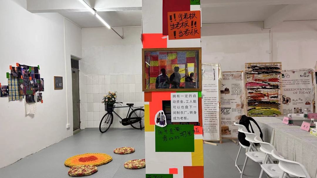 “握手楼”的照片、招租招工宣传栏造型的艺术装置、碎布料织成的百家被……一系列广州著名的城中村康乐村的生活场景化作展品,展现在观众的眼前。这个展览叫做“康乐的一天”,在康乐西约大街18号“吉一·青造社”展出。