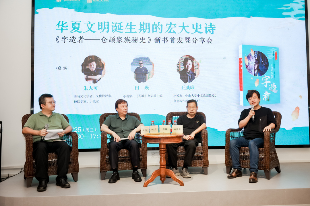 2024年9月25日下午,由花城出版社主办,花城文学院承办的《字造者——仓颉家族秘史》新书首发暨分享会,在花城文学院隆重举行。神话学家、小说家、本书作者朱大可,小说家、《花城》杂志前主编田瑛,小说家、中山大学文学院副教授王威廉参与了对谈。