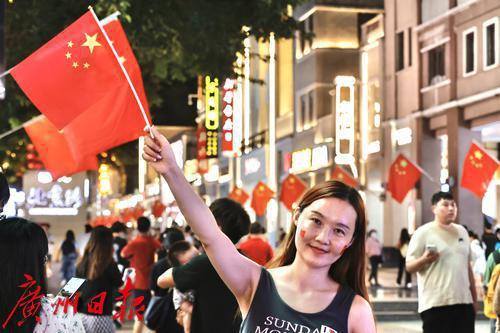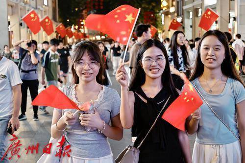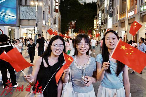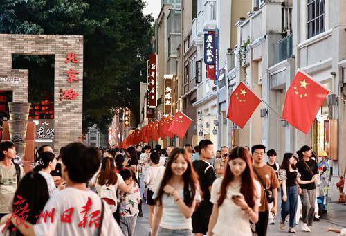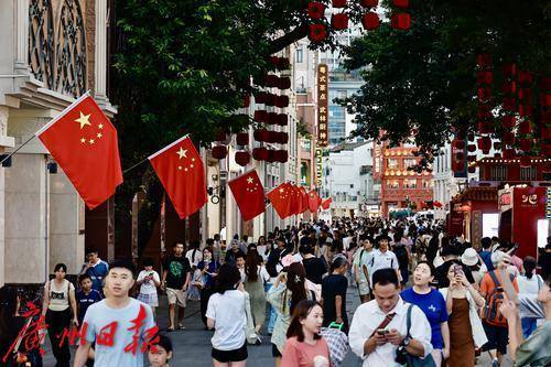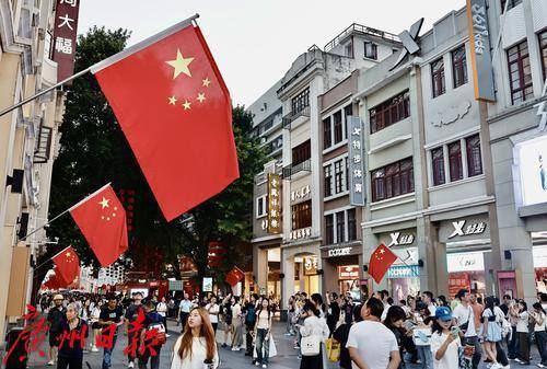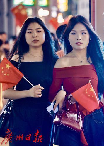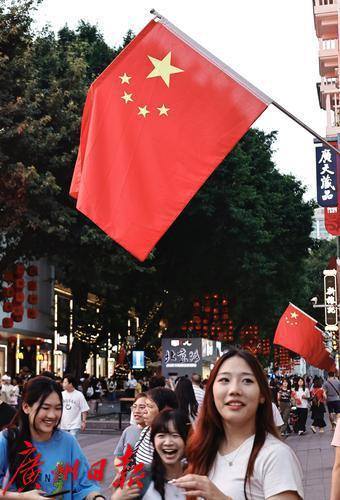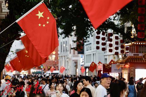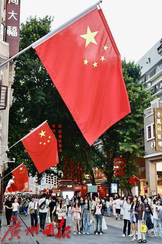 9月28日,广州北京路商业步行街张灯结彩,节日的气氛浓烈。市民手持国旗拍照留影,喜迎国庆。