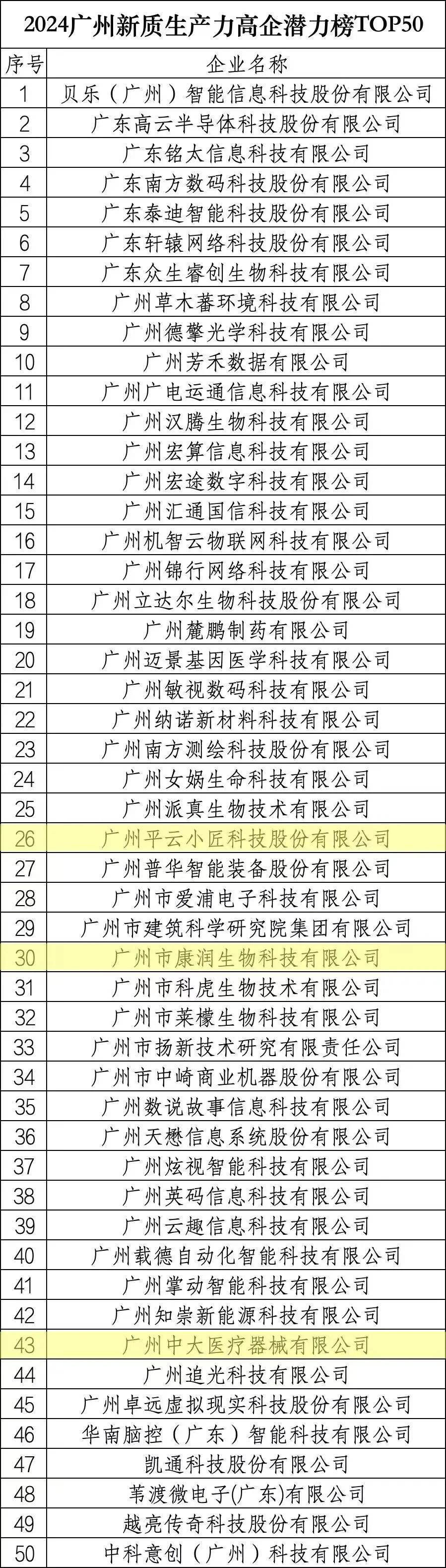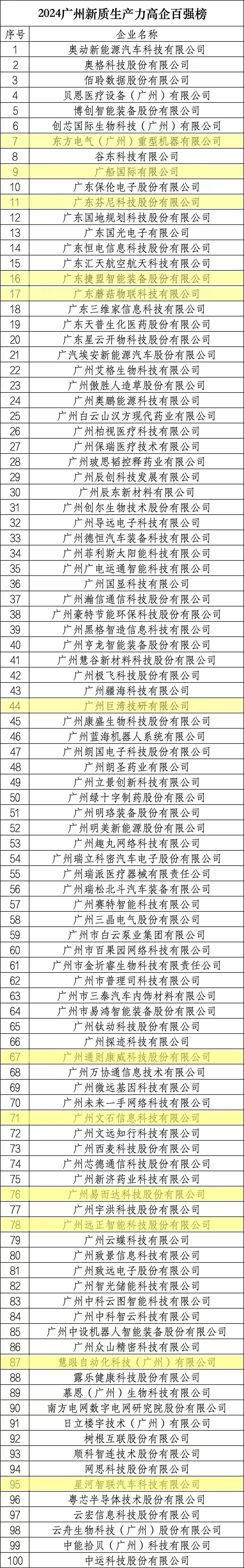 据介绍,广州已连续两年发布“拟上市高企百强榜”,今年榜单设置升级,聚焦新兴产业和未来产业,以“模型评分+大数据分析”等方式,评选出“2024广州新质生产力高企百强榜”“2024广州新质生产力高企潜力榜TOP50”,挖掘一批以高技术、高效能、高质量为特征的未上市新质生产力代表企业。