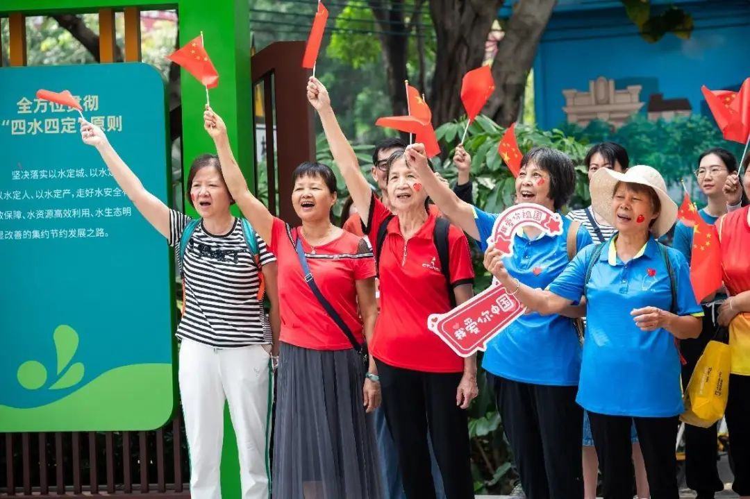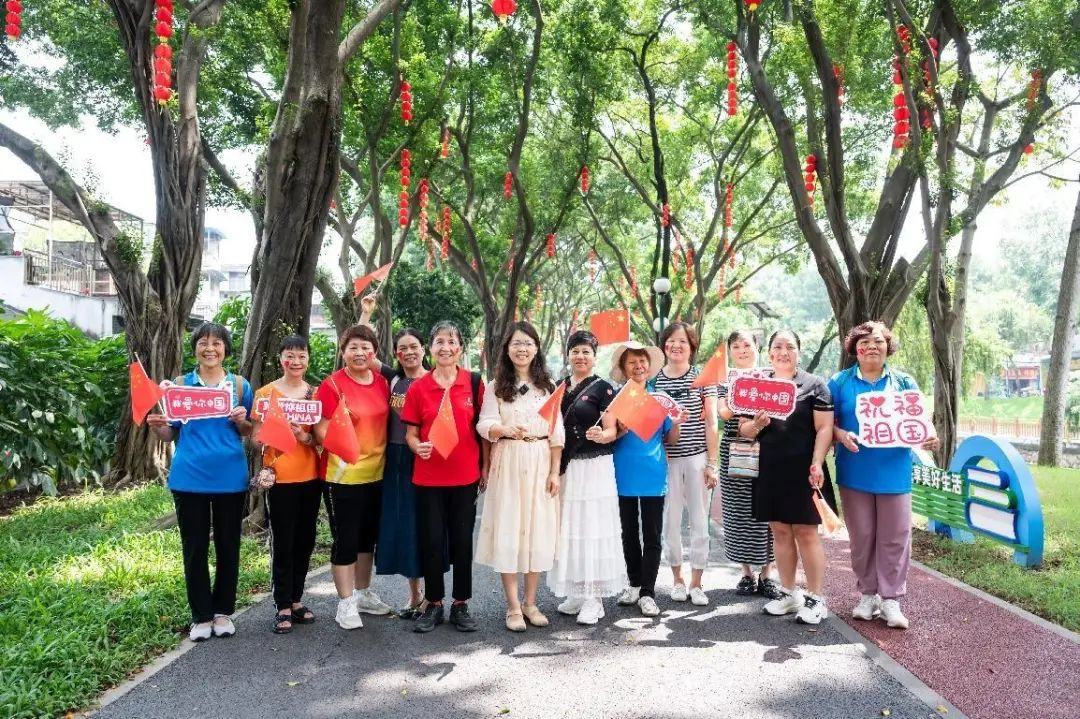 在快闪活动当天,南源街道在驷马涌绿道、电业党群服务驿站、风雨亭党群服务驿站设置了多个迎国庆打卡点,吸引了大量街坊前来打卡拍照,场面热闹非凡。这些打卡点通过鲜艳的红色背景板和精心设计的国庆主题标语,展现出浓厚的节日氛围。市民们手持“祝福祖国”“我爱你中国”等字样的手持牌,面带笑容,与背景中的龙舟、红旗等元素合影留念。