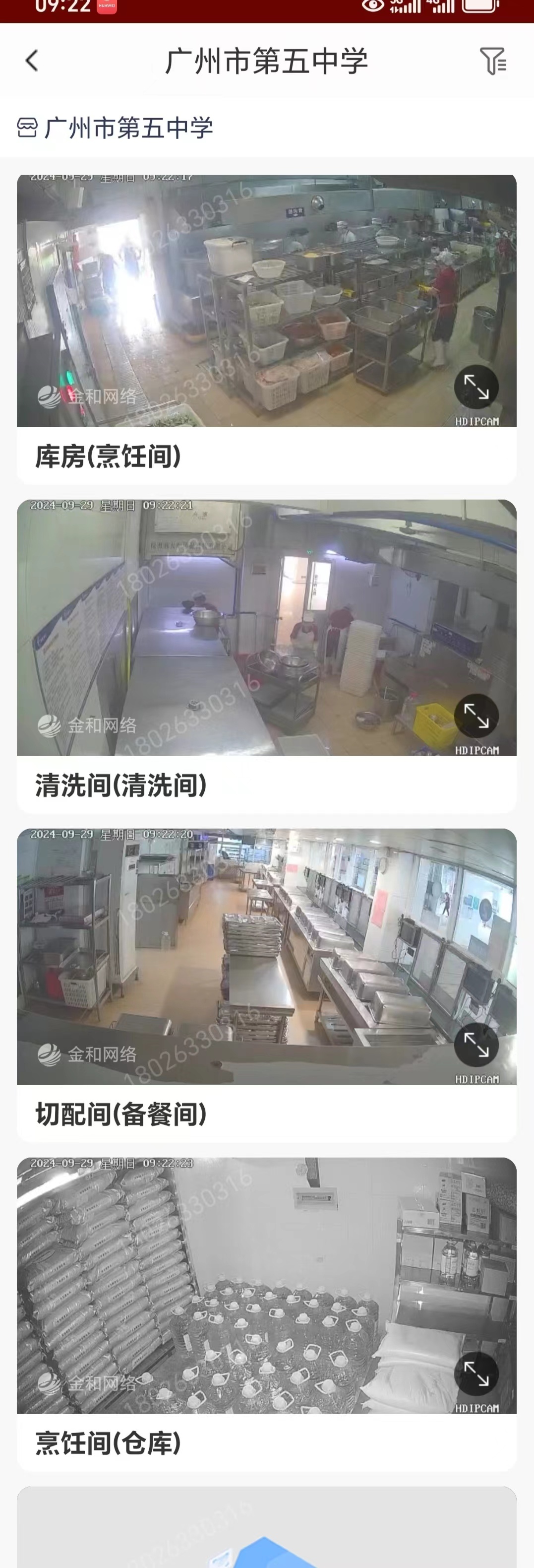 据媒体报道,目前广州市中小学和幼儿园食堂“明厨亮灶”覆盖率达100%,可视化监控覆盖率达100%。五中也达成“明厨亮灶”,饭堂后厨装有5个实时监控摄像头,24小时线上开放,约30位家委代表可随时通过监控查看饭堂仓库、加工间、配餐间等场室的实时动态画面。