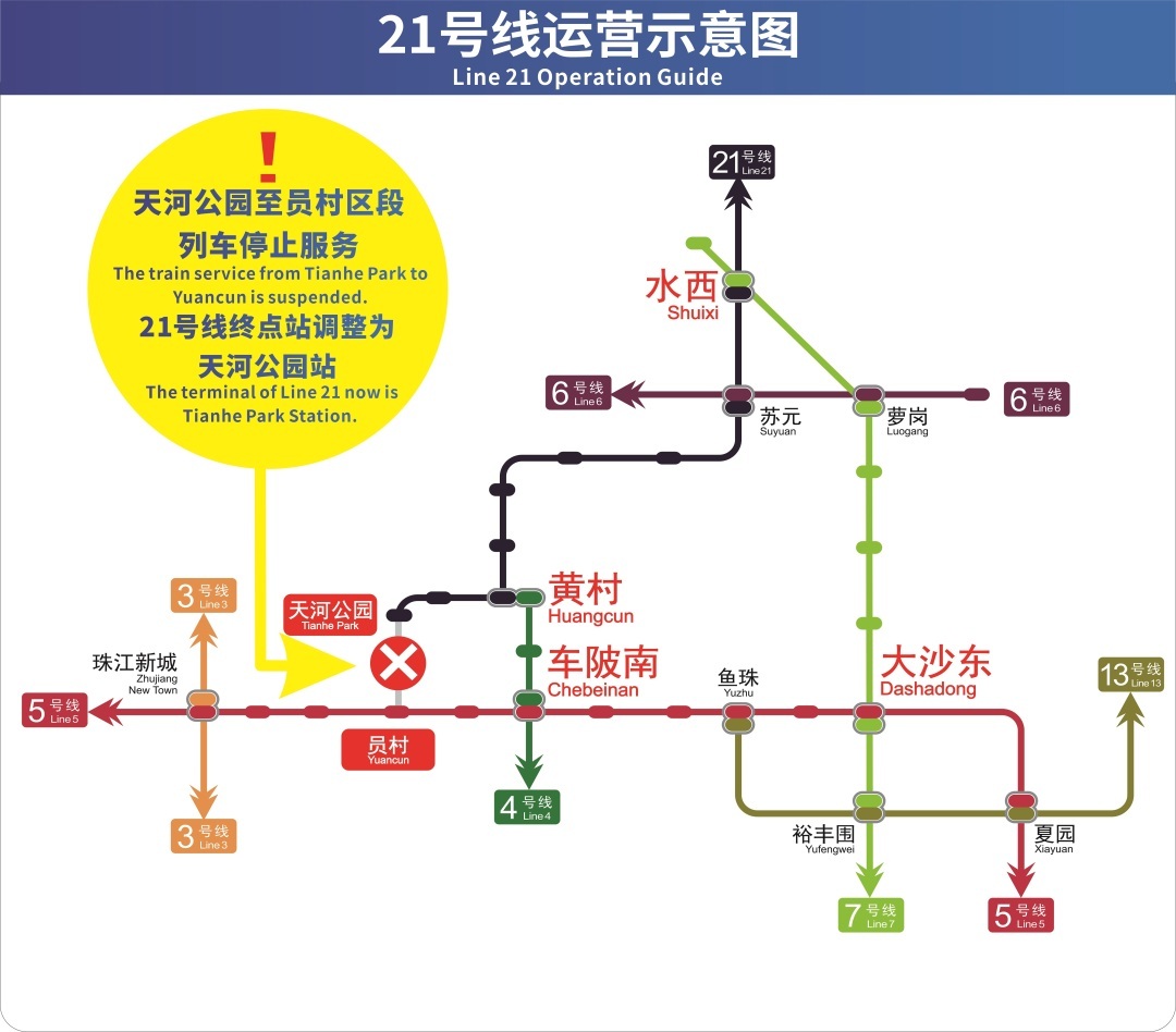 9月29日,广州地铁再次发布提醒,10月2日起21号线将进行拆解施工,当天运营时间起天河公园至员村区段的列车将正式停止服务,21号线终点站将由员村站调整为天河公园站。