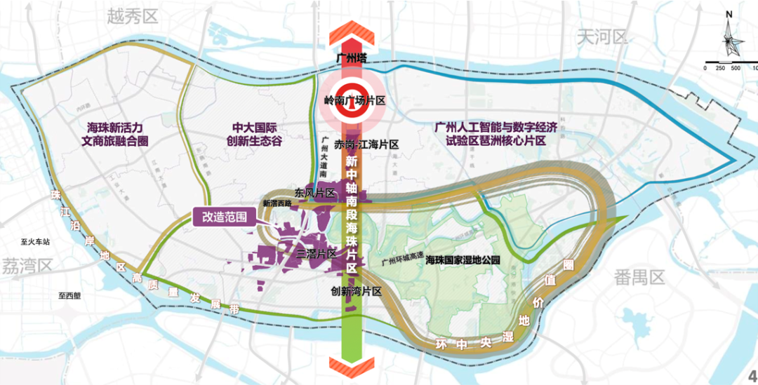 推动新中轴海珠片区改造,是落实广州三轴融合战略,强化世界城市核心服务功能,提升中心城区魅力名片的重要抓手。按照“依法征收,净地出让”新模式,充分发掘片区内广州塔、海珠湖、海珠湿地公园等高品质生态、旅游、文化资源,在更新改造中通过“消费引领、生态提质、创投集聚”策略,将新中轴海珠片区建设成为布局合理、功能完备、交通畅达、生活便利、产业高端、生态优良、宜居宜业的国际商圈活力中心和城央生态休闲胜地,成为广州城市形象新地标、高质量发展新增长极和产城融合示范新区。