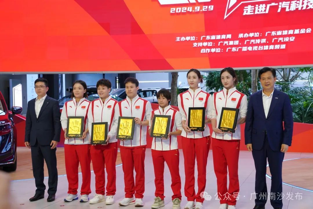广汽集团董事长曾庆洪为跳水冠军全红婵、谢思埸、陈艺文,羽毛球冠军陈清晨,花样游泳冠军王柳懿、王芊懿,中国体育代表团花样游泳教练王九莉,广东省羽毛球教练张少辉,跳水教练何威仪、贺帅交付定制钥匙。随后,广东奥运冠军们也按下泥模手印回赠广汽集团。