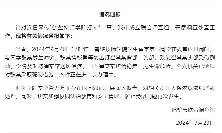 经查,2024年9月26日17时许,鹤壁技师学院学生崔某某与同学在教室内打闹时,与同学魏某发生冲突,魏某持板凳等物击打崔某某背部、头部,致使崔某某头部受伤倒地。学院及时将崔某某送医治疗,目前崔某某伤情稳定,无生命危险。公安机关已依法对魏某采取强制措施,案件正在进一步办理中。