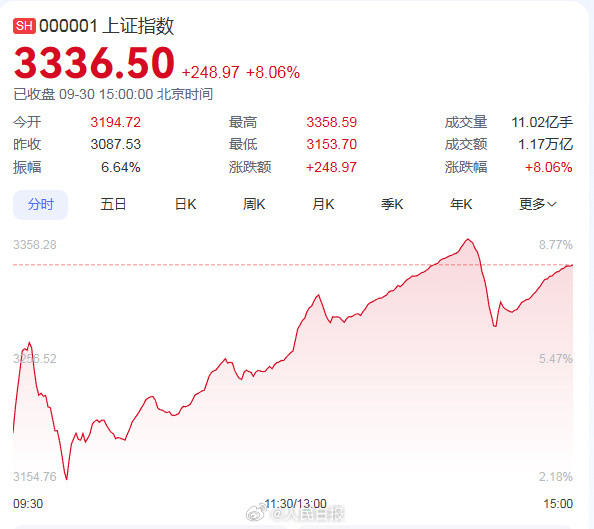 截至2024年9月30日收盘:上证指数(000001)涨8.06%站稳3300点,深证成指(399001)涨10.67%,创业板指(399006)涨15.36%,科创50、北证50指数均收涨逾15%,同步刷新历史最好成绩。近40只行业ETF涨停,超3000股涨幅超9%。A股全天成交超2.6万亿元,创历史新高。