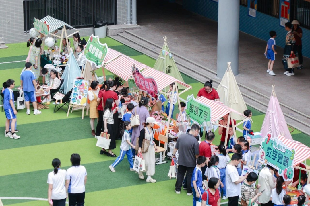 4月末,红岭深康学校举办了首个“红康汇”。教学楼外、操场上,11个主题街市、100余个店铺有序林立,从手工艺品到班级、校园周边,从体验游戏到创意服务,应有尽有,琳琅满目;入口处还设置了“红康银行、市场监管局、专利局、工商局”等红康汇活动保障店铺,一位位“银行行长、监督局局长”由学生坐镇,耐心热情地为卖家、买家提供帮助和服务;所有店铺产品均由孩子们定价售卖,可现金、扫码交易。这是孩子们“源于课程,服务学习”的体验场,孩子是主角。