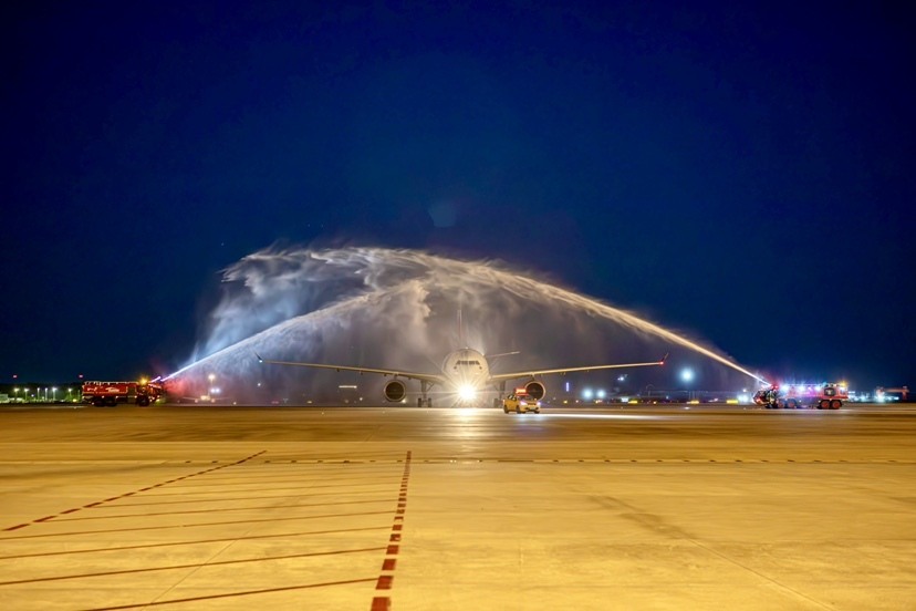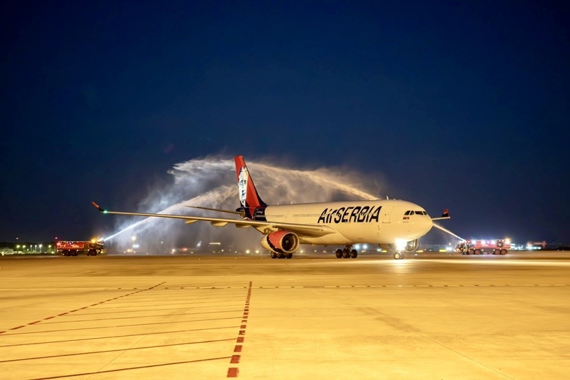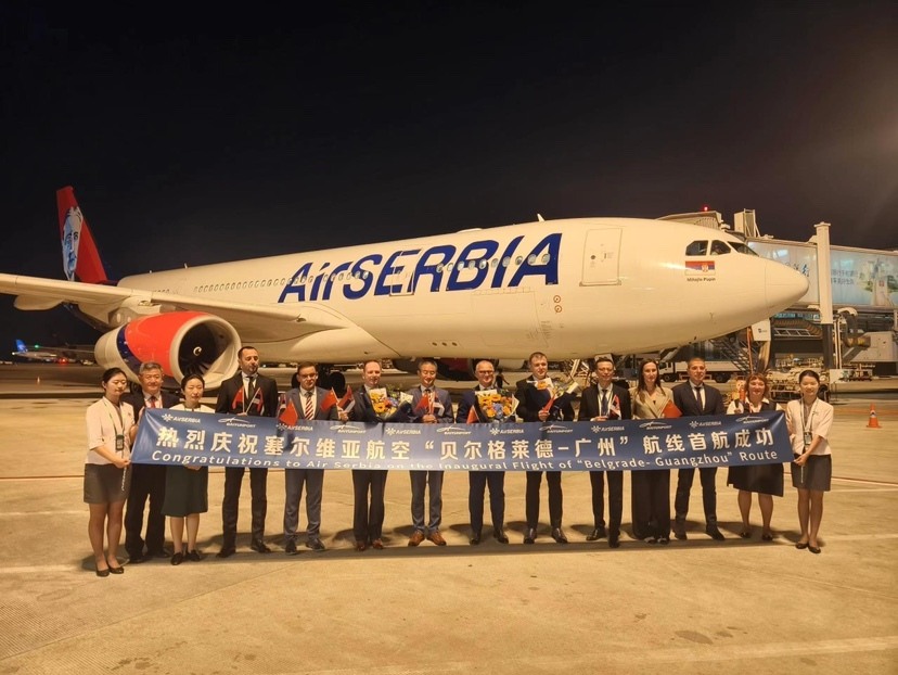 9月30日18时41分,一架航班号为JU988的塞尔维亚航空航班飞抵广州白云国际机场,这标志着塞尔维亚航空“贝尔格莱德—广州”航线成功首飞,广州白云国际机场以民航界最高礼仪“水门礼”欢迎“塞铁”的到来。该直飞航线的开通,将为中塞两国的经贸合作、文化交流与人员往来带来极大便利。