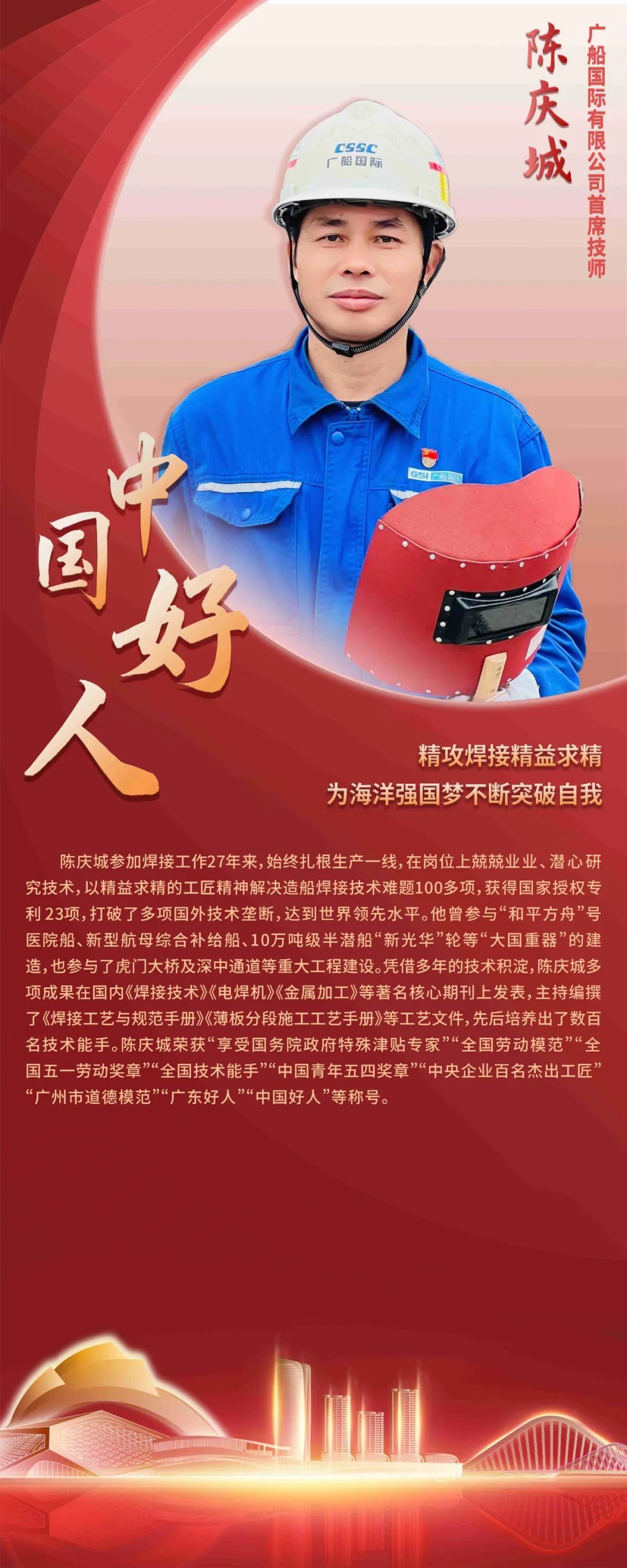 陈庆城曾参与建造“和平方舟”号医院船、10万吨级半潜船“新光华”轮等“大国重器”,也参与了虎门大桥及深中通道等重大工程建设,被誉为“国宝级”焊工。