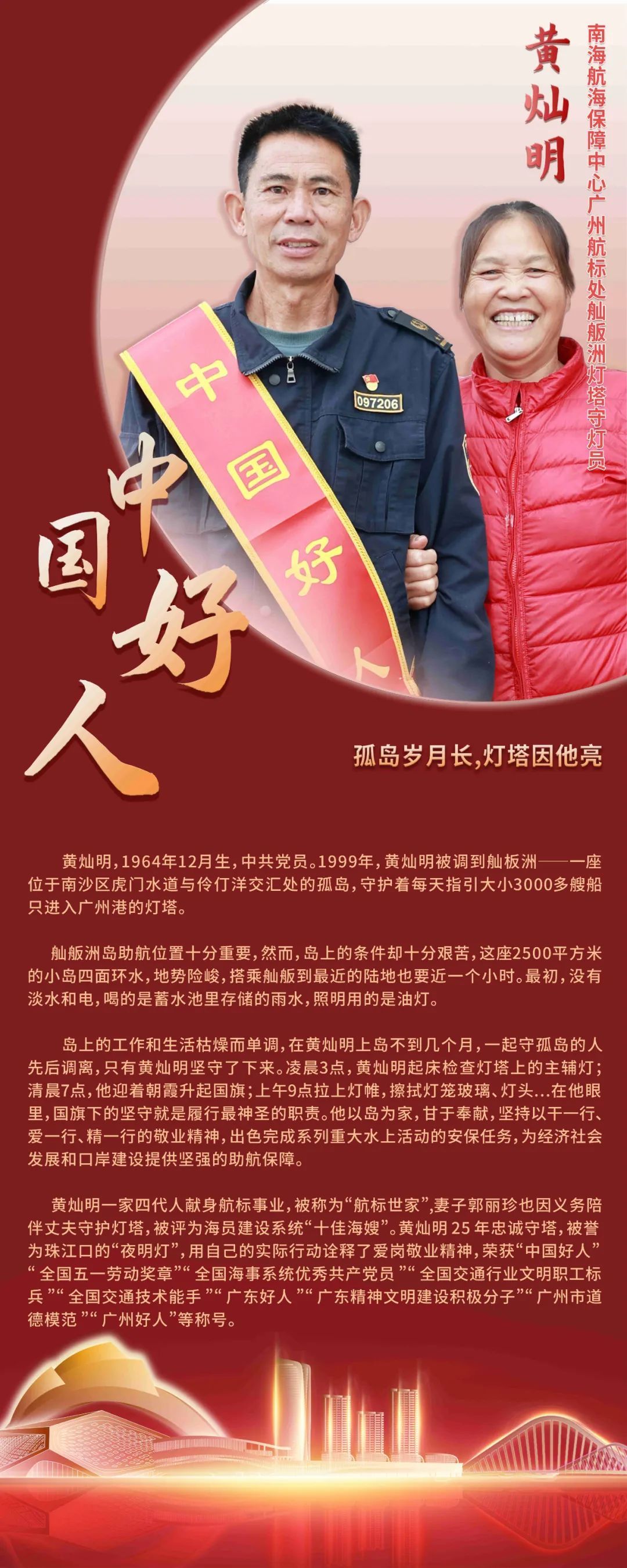 自1999年到舢舨洲工作后,面对恶劣环境和孤岛生活,他25年如一日,守护着岛上每天指引3000多艘船只进入广州港的灯塔,被誉为“广州南沙舢板洲灯塔的守护神”。