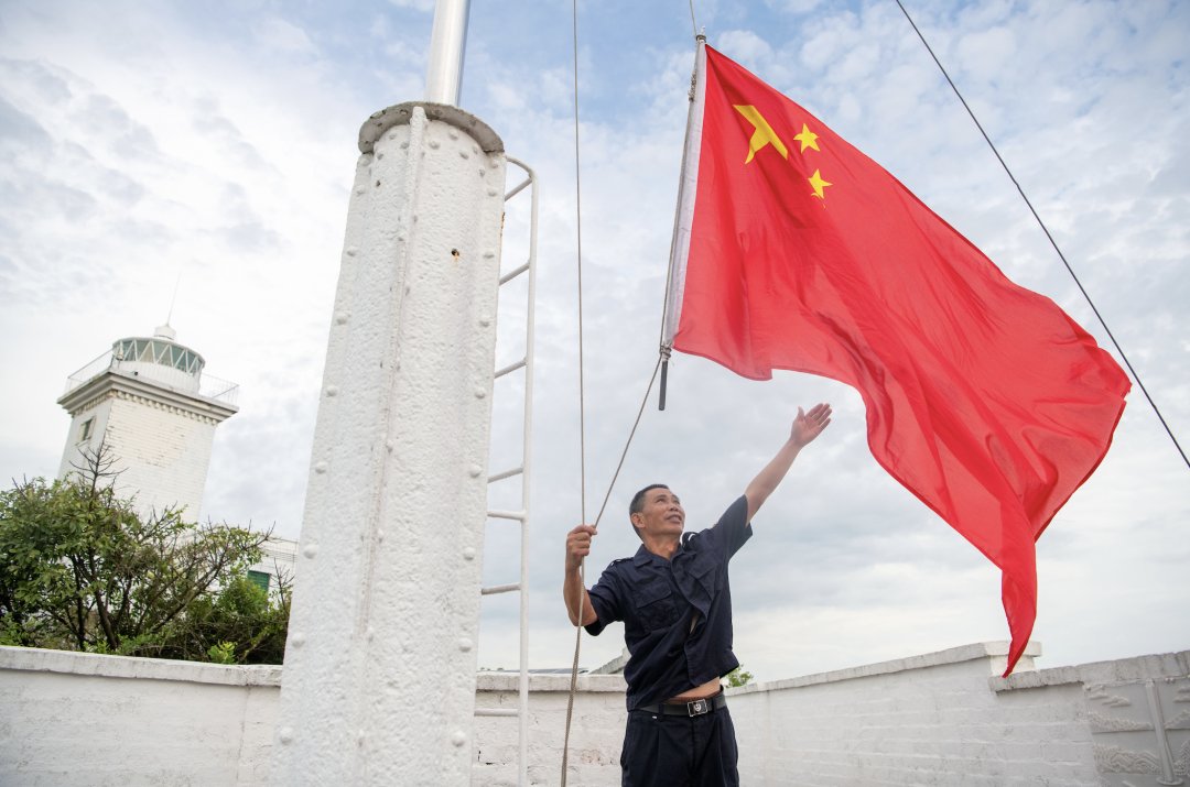 晨曦中的舢舨洲岛上,灯塔守护员黄灿明迎着初升的太阳,庄重地将五星红旗缓缓升起。灯塔是船舶安全通行的航标,而国旗是黄灿明坚守的航标。年近六旬的他,自1999年起便扎根于此。升国旗、检查塔灯、擦拭太阳能板……这些每日例行工作,黄灿明坚持了25年。