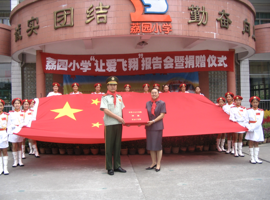 2005年,荔园小学成立广东省首支校园女子国旗护卫队,由天安门国旗班原班长赵新风担任校外辅导员。当时正是赵班长把“13号国旗”交到了荔园小学国旗护卫队手中。每年9月新学年第一学期的开学典礼,学校都会展示这一面五星红旗。