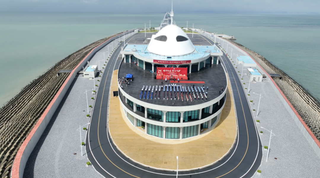 9月21日,港珠澳大桥蓝海豚岛,粤港澳三地出入境管理部门首次联合举办升旗仪式
