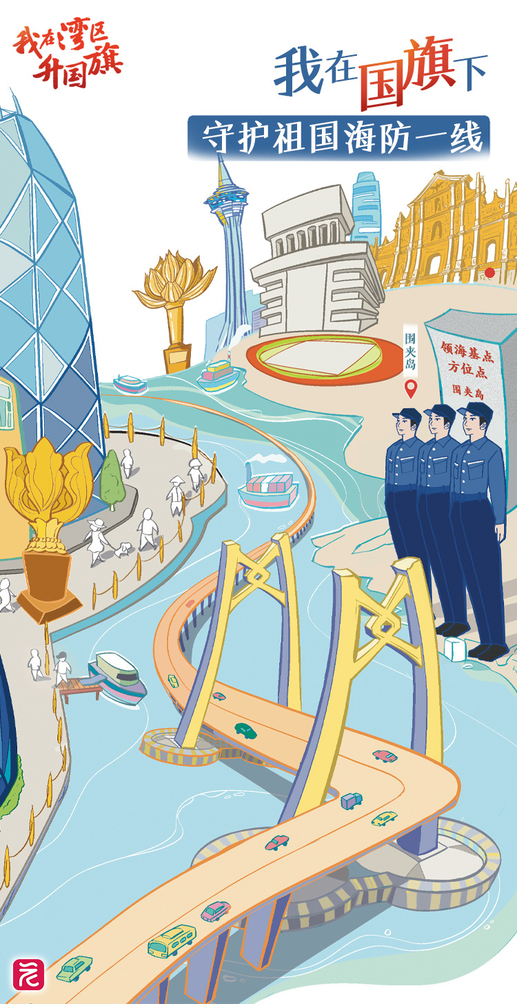 湾区同升一面旗,映照信仰信念。香港、澳门土地上,朱涛成为第一位将五星红旗在此升起的中国军人;澳门濠江中学,全校师生每周一上午都会举行升国旗仪式;港珠澳大桥,国旗下粤港澳居民同心相融;江门围夹岛领海基点,海警执法员在出航巡护前仔细整理这面见证忠诚坚守的旗帜……五星红旗里,有大湾区人始终不渝的初心。
