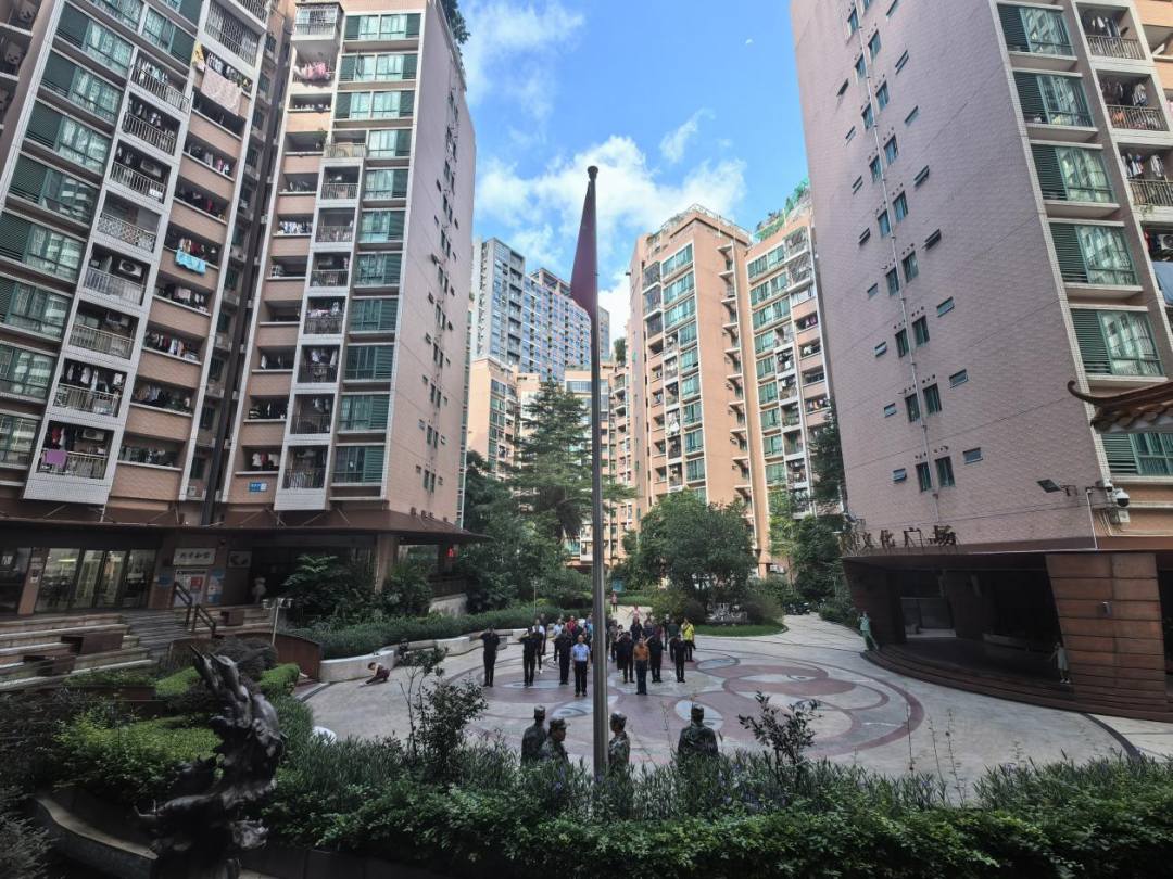 周一早晨,位于深圳市罗湖区的渔民村社区在晨光中被渐渐唤醒,居民三五成群地聚拢到小区文化广场旗杆前。8时40分,随着护旗手正步走进广场,升旗仪式正式开始。这是每周一小区自发举行的升旗仪式,每逢重要日子也会举行,已经持续了十多年。