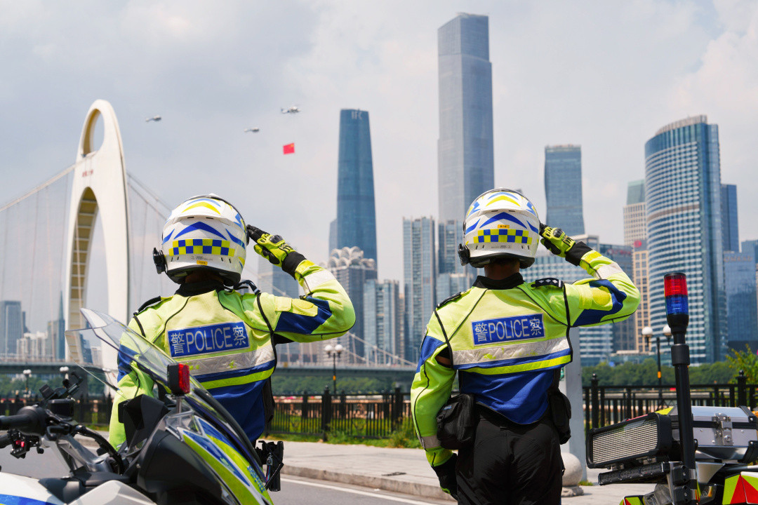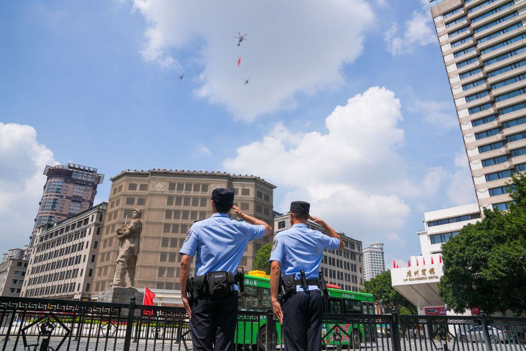 10月1日,广州市公安局指挥中心警航支队出动3架警用直升机悬挂国旗编队巡逻飞行。当警用直升机悬挂着五星红旗出现在广州中心城区时,众多市民、游客驻足仰望。