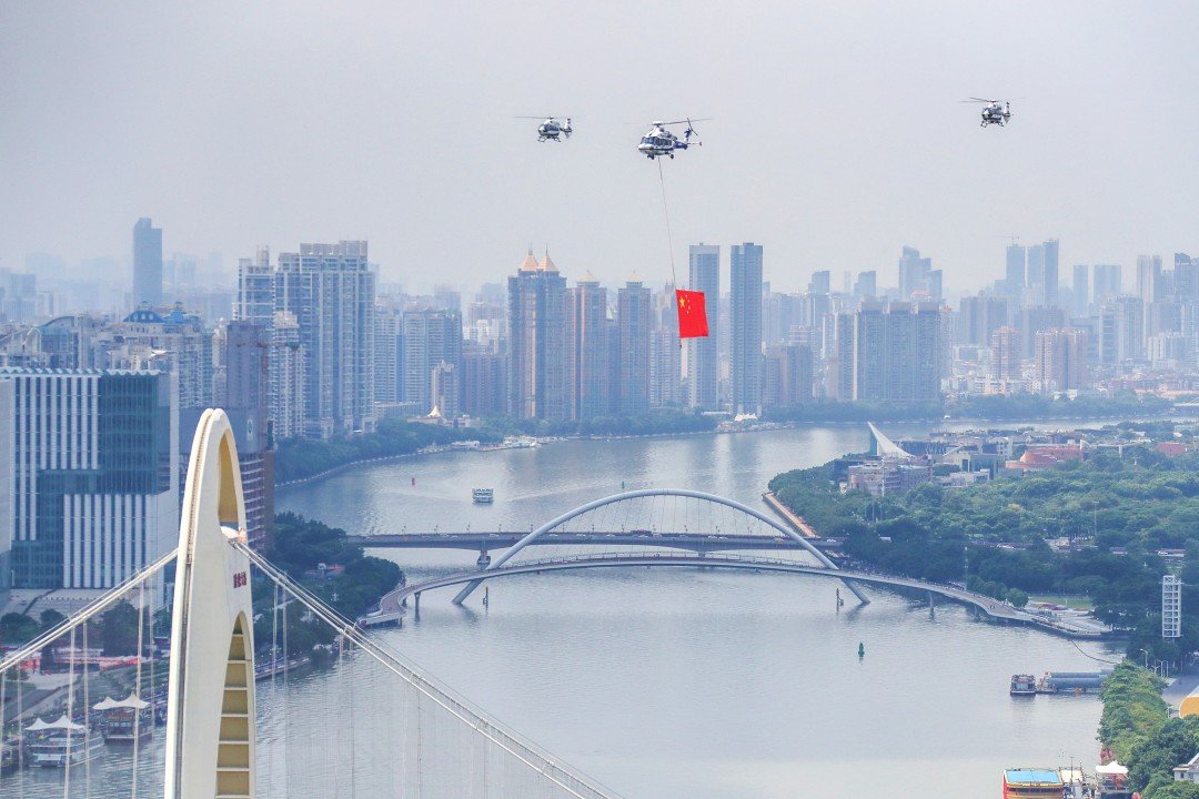 当天上午,长机H175警用直升机悬挂国旗,2架僚机均为H145警用直升机,于左右两侧编队护航。三机编队呈“品”字形围绕市中心城区——珠江沿岸飞行,依次驶过白鹅潭、二沙岛、海心沙、花城广场等广州市区地标的上空。