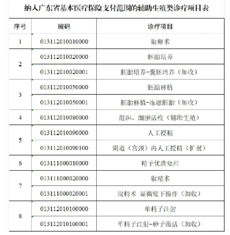2024年10月1日起,广东省将“取卵术”“胚胎培养”“胚胎移植”“组织、细胞活检”“人工授精”“精子优选处理”“取精术”“单精子注射”等8个不孕不育辅助生殖技术治疗项目纳入医保报销范围。