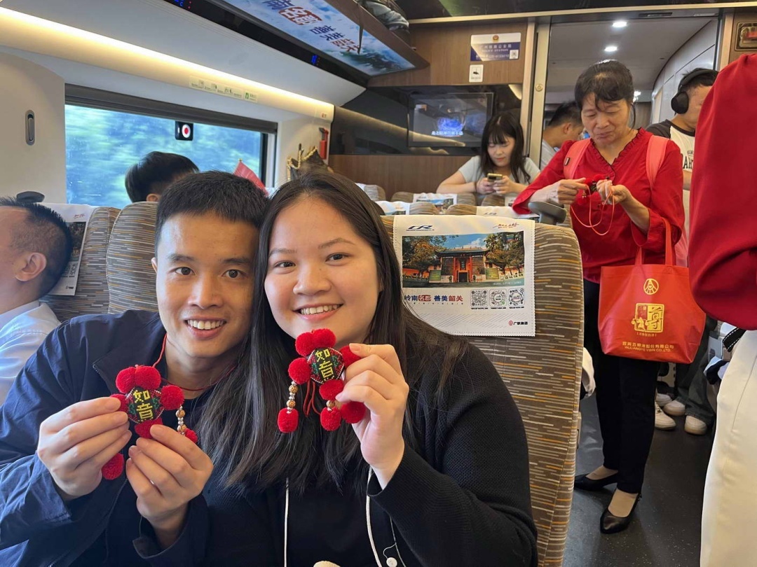 “广府人的故居在哪里”“张九龄的望月怀远谁能背出来”……车厢内,乘客踊跃参与趣味抢答,收获了丹霞山钥匙扣、风采楼冰箱贴、红军长征粤北纪念馆文创笔袋、乳源瑶族刺绣挂饰等韶关特色文创纪念品,惊喜之情溢于言表。“早就听说过丹霞山,一直想找机会去。有了‘韶关号’,更想去看看。”潮汕乘客王先生说。