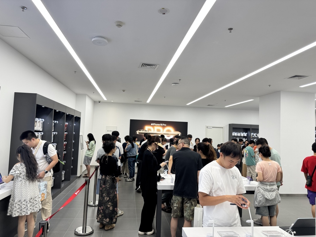 记者在位于海珠区的广州京东MALL看到,在3C手机、空调、扫地机器等楼层,人流旺盛,在空调楼层,商场还专门设立一个“以旧换新”的支付区域,并且排起了长龙。在3C数码区域,苹果、华为、OPPO、荣耀、小米等柜台都相当热闹。“我们每天iPhone 16 Pro和iPhone 16 Pro Max货量有限,是否能买到,就要看当天的库存情况。”