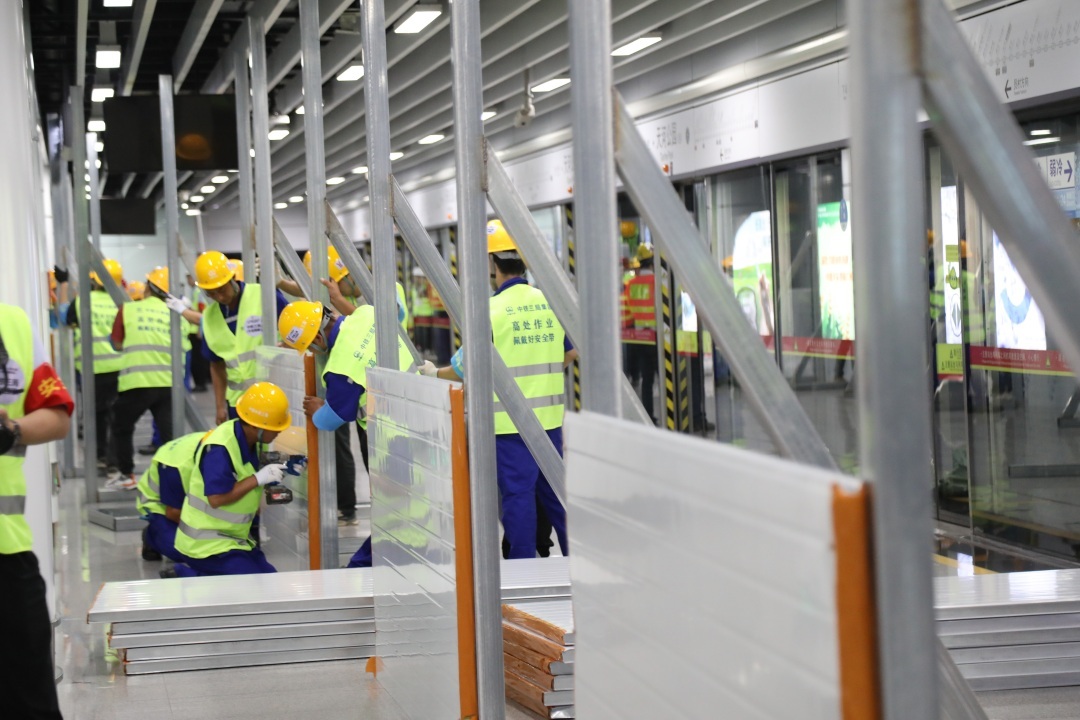 10月1日晚上11时,在一切准备就绪后,广州地铁组织275名作业人员同时进场施工作业。由于天河公园车站围蔽长度较长,要在1个晚上将约370米长度的区域围蔽完成安装,施工难度大。为了不影响天河公园站的正常运营,车站围蔽分2期进行:一期围蔽是对天河公园站两侧站台不影响乘客乘车的66米区域进行围蔽,同时将站台2处临时物料区进行围蔽,于9月27日完成。二期围蔽则将站台剩余共计约240米区域进行围蔽,在10月1日收车后至2日凌晨期间施工完成。