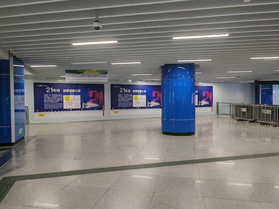 2日上午,记者实地走访看到,员村站属于原21号线的区域已加装了围蔽挡板,包括换乘通道、站厅站台以及A、E、F三个出入口,天河公园站原属于21号线的1和2站台也同样进行了围蔽,围蔽现场有“21号线运营调整公告”等醒目告示。同时,在天河公园站,新启用作为21号线列车停靠和乘客上下车的3、4站台,这也是未来21号线拆解完成后继续停靠的站台。