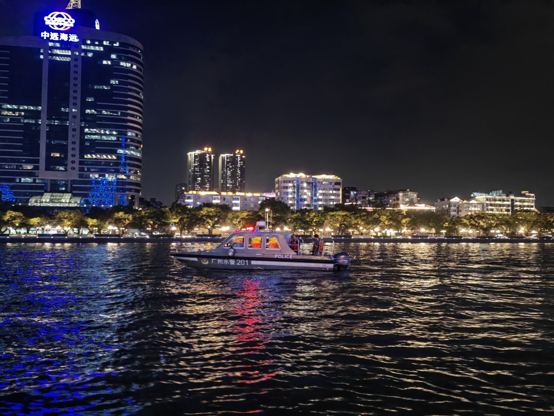 临近19时,孙鑫带领巡组驾驶快艇从派出所码头出发,开始了水上巡逻。快艇闪烁着警灯,穿梭在珠江“光影画卷”中。这样的夜巡每晚要开展两次,一次需要约1.5小时。