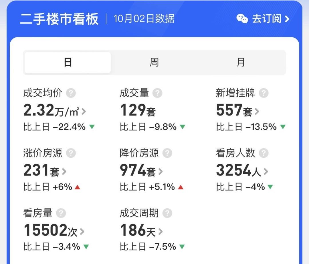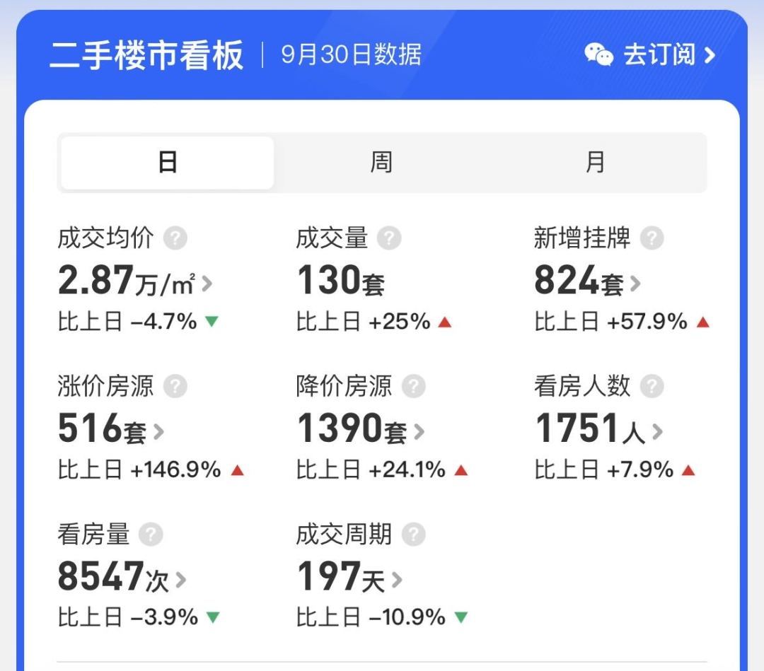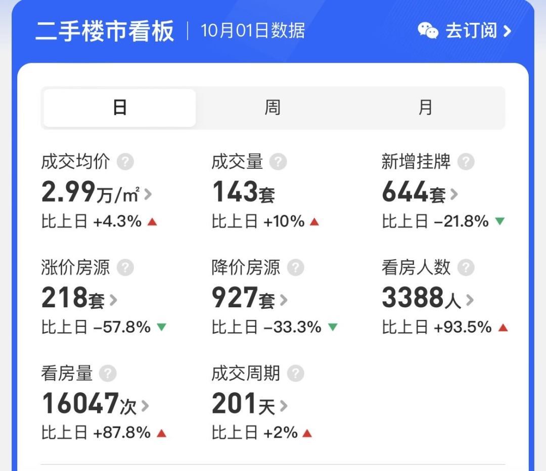 贝壳找房平台的数据显示,国庆长假前两天每天二手房看房人数都达到3000多人,看房量超过1.5万次,比9月30日增长90%左右。10月1日成交套数为143套,10月2日成交量为129套,每日新增挂牌房源600套左右,涨价房源200多套,降价房源900多套。而9月30日,成交套数为130套,新增挂牌房源824套,涨价房源516套,降价房源1390套。和限购全面放开前的一周(9月23日~9月29日)周成量644套,日均成交92套,日均看房人数2300多人来比,均有明显增长。