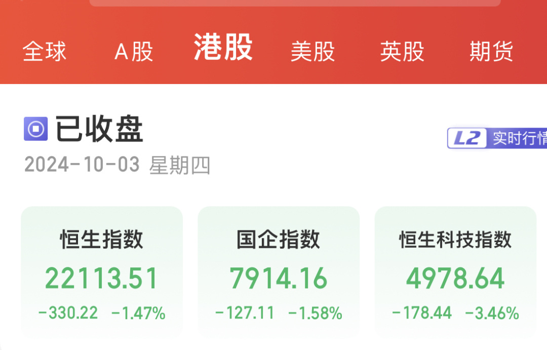 10月3日,港股大幅震荡,开盘后“大跳水”, 恒生指数一度跌超4%,恒生科技指数一度跌超7%。不过,午后港股强势拉升,出现“V型”反弹,多个指数跌幅大幅收窄。
