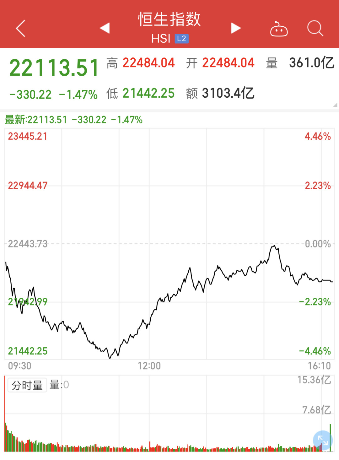 截至当日收盘,港股恒生指数和恒生科技指数均终结日线六连涨,其中恒生指数跌1.47%,报22113.51点,恒生科技指数跌3.46%,报4978.64点,国企指数跌1.58%,报7914.16点,红筹指数跌2.15%,报4201.04点。