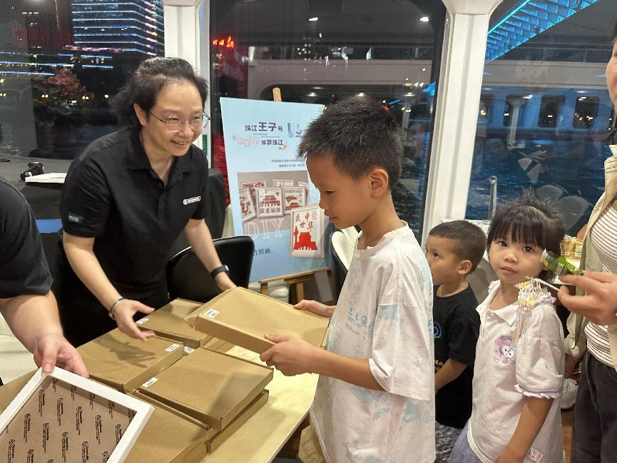 除了音乐盛宴,珠江王子号还推出了“岁月编织”亲子DIY活动。现场提供了竹编材料,并有专人负责教授游客如何制作中国传统手工作物——编竹织画。小朋友们和家长们一起动手,用小小的竹片绘制出心中的图案,制作出一幅幅独特的作品。这不仅让孩子们感受到了中国传统文化的魅力,也增强了家庭成员之间的互动与合作。而在珠江公主号上,则举办了“手绘国风团扇”亲子DIY活动。游客们以画笔和丰富的色彩颜料,在扇面上描绘出自己喜爱的画面。从梅兰菊竹等传统元素到动漫IP小猪佩奇、米老鼠等,游客们随心所欲地发挥着自己的想象。一位带着孩子的母亲李女士说:“这个活动既能让孩子们学到传统文化,又能让他们发挥创造力,我觉得非常有意义。”