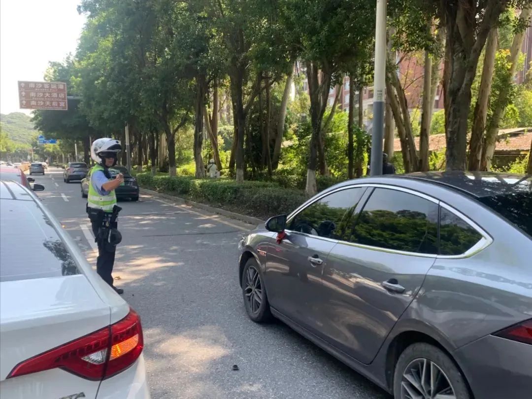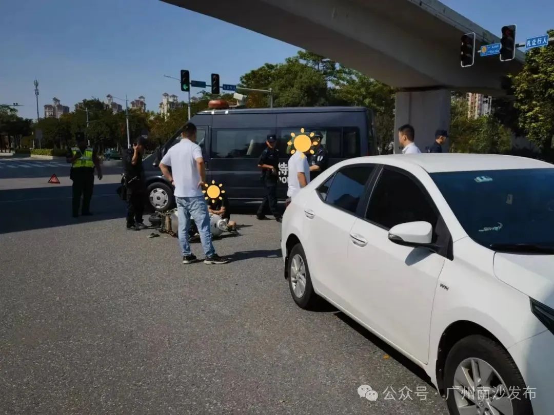 10月1日上午,巡特警大队巡组刘虎、赖栋华、曾振鑫等人在南沙万达广场附近巡逻时,发现一宗小汽车与电动自行车相撞的交通事故。他们立即上前了解情况,协助救助伤员并维持现场交通秩序。