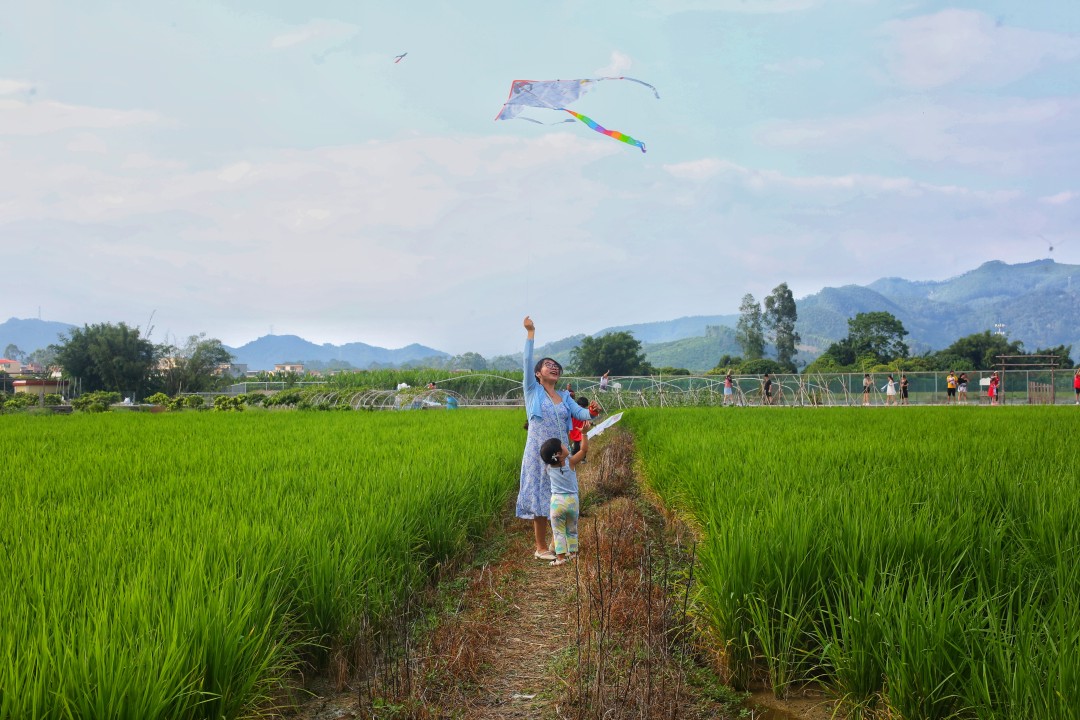 市民游客国庆在增城朱村丝苗米原产地的稻田旁开展放风筝等亲子活动,阖家团聚其乐融融。