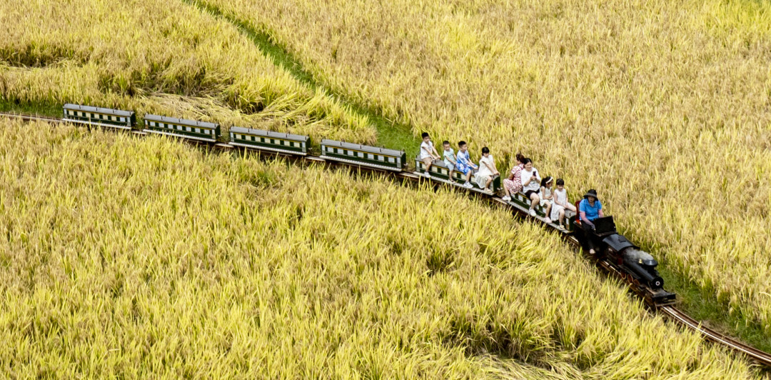 在广州增城朱村丝苗米产地,市民游客在稻田附近乘坐小火车。