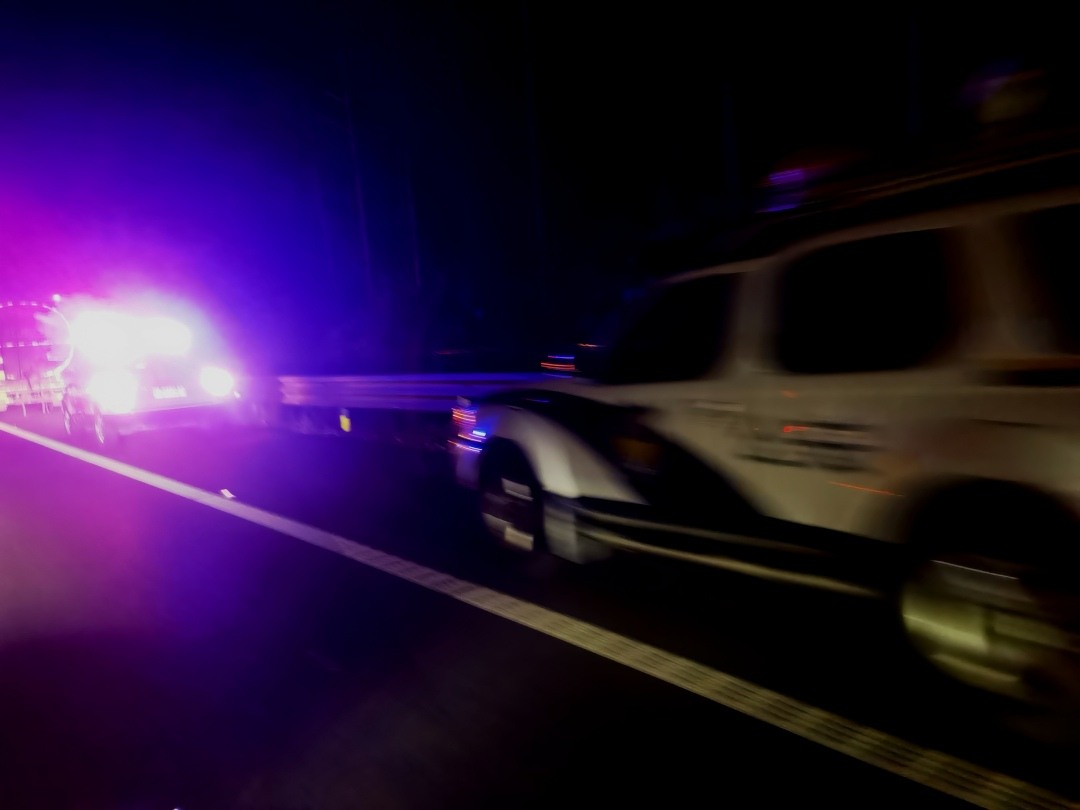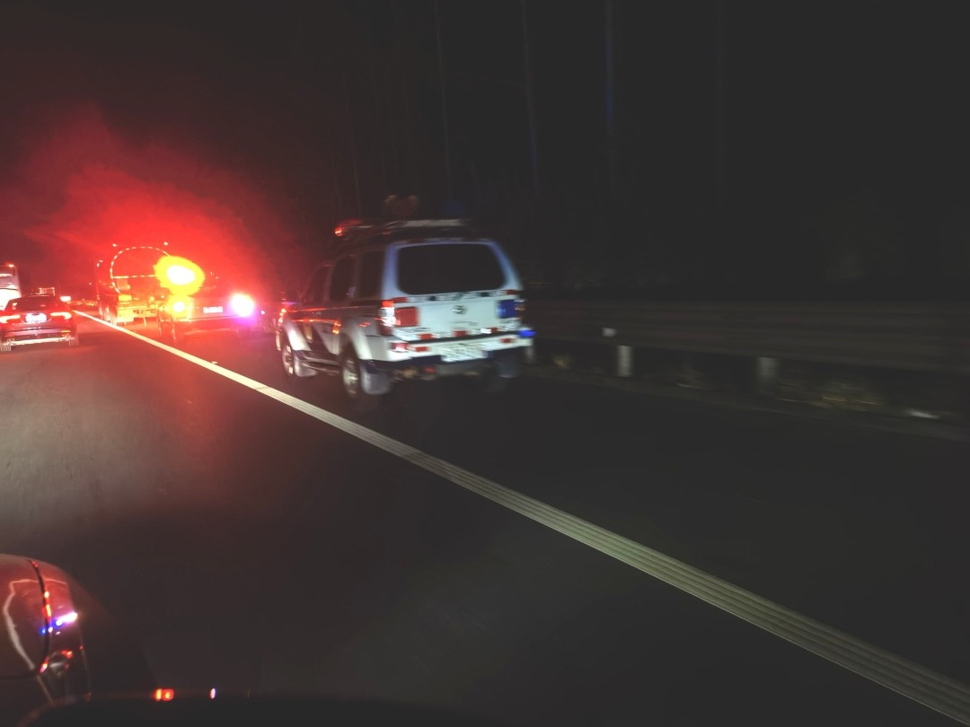 2024年10月5日晚,在应急道上“执勤”的阳江交警执勤车。