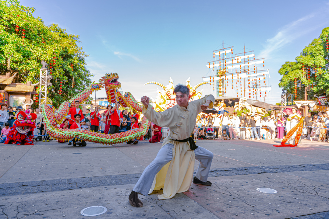 佛山作为一座拥有数百年历史的岭南文化名镇,以其深厚的武术和舞狮传统而闻名。国庆期间,长鹿旅游休博园将武术表演与佛山传统舞龙舞狮文化融合编排。在名曲《男儿当自强》背景音乐中,演员化身武术宗师进行表演,展现出百年前佛山武林卧虎藏龙、门派盛放的场景。一名外籍游客表示:“中国功夫很棒,佛山武术的表演很精彩,大开眼界!我还现场跟师傅学了几招。”
